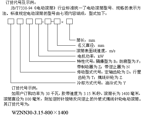 (2).用戶訂購逆止電動滾筒時,須注明旋轉(zhuǎn)方向,如不注明則為任意方向。其表示方法為在特性代號后加“S”(表示在電機引出線一側(cè)觀察,端蓋應(yīng)順時針旋轉(zhuǎn))或“N”(表示在電機引出線一側(cè)觀察,端蓋應(yīng)逆時針旋轉(zhuǎn));