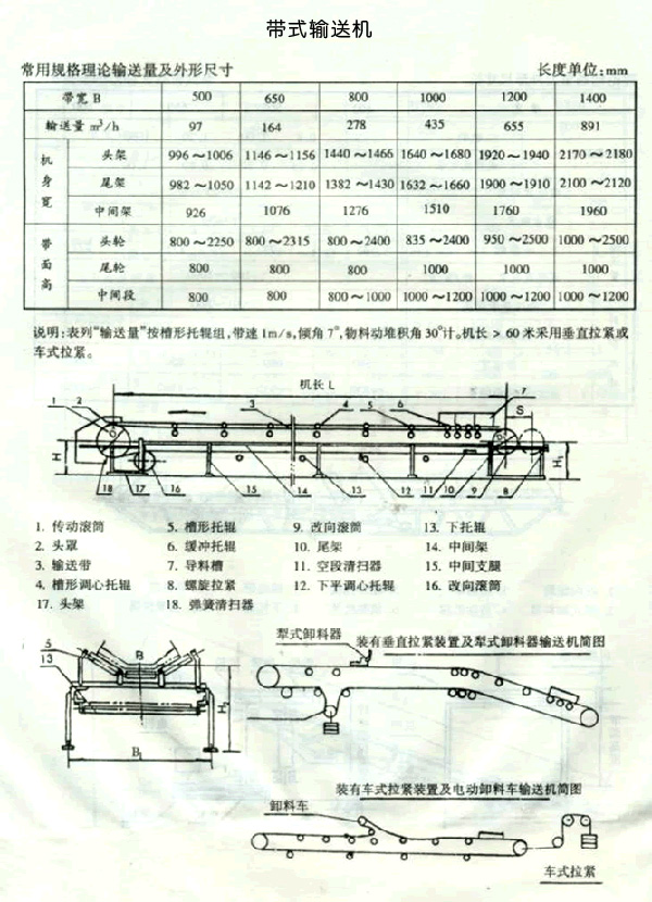 帶式輸送機是一種輸送量大、運轉費用低、適用范圍廣的輸送設備。按其支架結構固定式和移動式兩種;按輸送帶材料有膠帶、塑料帶和鋼帶之分。目前以膠帶輸送機使用最廣;塑料帶是一種新型材料,使用日漸增多;鋼帶主要用于高物料。輸送機的工作環(huán)境溫度一般在-10∽+40°之間,其傾斜角最大不超過30°,要求物料溫度不超過70℃;耐熱橡膠帶輸送120℃以下的高溫物料。物料溫度更高時不宜采用膠帶輸送機。當輸送具有酸性、堿性、油類物質和有機熔劑等成份的物料時,需采用耐油、耐酸堿的橡膠帶或塑料帶。